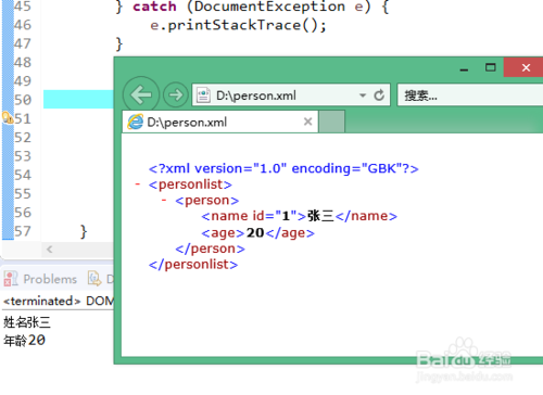 運(yùn)行程序后,結(jié)果如下圖所示,我們通過對比控制臺輸出的結(jié)果和XML原文件,可以發(fā)現(xiàn)DOM4J能夠快速而準(zhǔn)確的解析出XML文件。