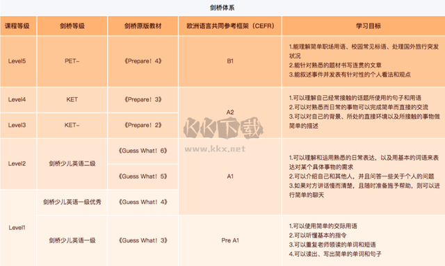 而劍橋英語課程設(shè)為L1~L5共5個級別,分別對標(biāo)CEFR、劍橋考試等級,最高級別可達(dá)PET水平,并且該課程使用劍橋原版教材,整體學(xué)習(xí)目標(biāo)要求較高。