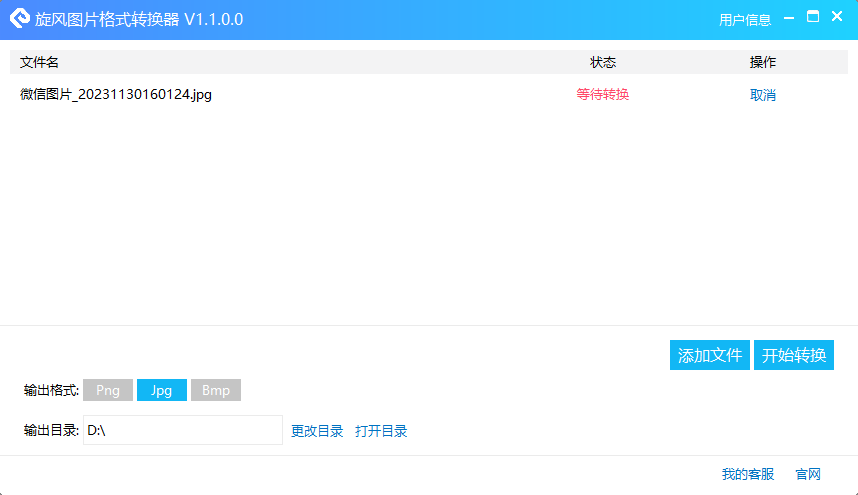 1、打開旋風圖片格式轉換器并拖拽或者點擊"添加文件"按鈕添加您需要轉換的文件添加到轉換列表中等待轉換,如下圖所示: