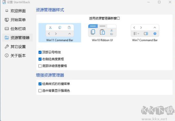 StartAllBack 內(nèi)置了一項經(jīng)典右鍵復(fù)原功能,首先進入它的主界面,打開“資源管理器-增強資源管理器”標簽,接下來勾選“經(jīng)典樣式的右鍵菜單”。