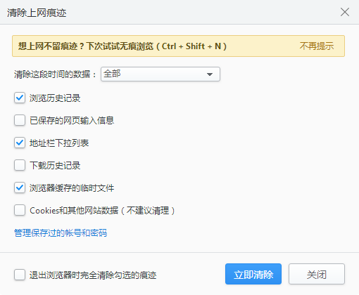 2、在清除上網(wǎng)痕跡界面,選擇需要清理的內(nèi)容,你也可以試試快捷鍵Ctrl+Shift+N