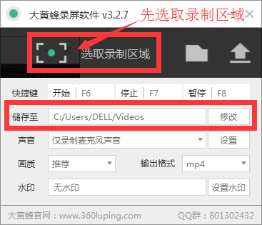 3.完成安裝后點擊立即啟動打開軟件,選定錄制的電腦屏幕區(qū)域,點擊軟件提示區(qū)的【選取錄制區(qū)域】,自定義錄制窗口大小。對保存位置建議選擇自己熟悉的文件夾,不要放到C盤即可。