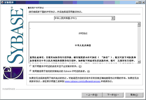 4、如上圖:選擇“中華人民共和國(guó)(prc)”,這里如果你英文好,你也可以選擇安裝英文版的,在選擇“我同意適用于指定的安裝地點(diǎn)的Sybase許可證條款”,然后在點(diǎn)擊“下一步”進(jìn)行安裝,