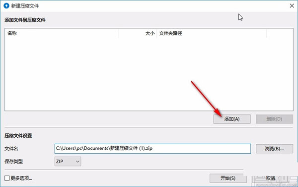 2、進(jìn)入到新建壓縮文件界面之后,我們?cè)诮缑嬷悬c(diǎn)擊添加按鈕進(jìn)行壓縮文件的添加;