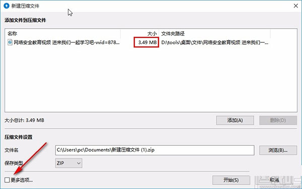 2、點(diǎn)擊對(duì)話框底部的“更多選項(xiàng)..”。這有一個(gè)用于拆分文件的下拉菜單(分卷)。