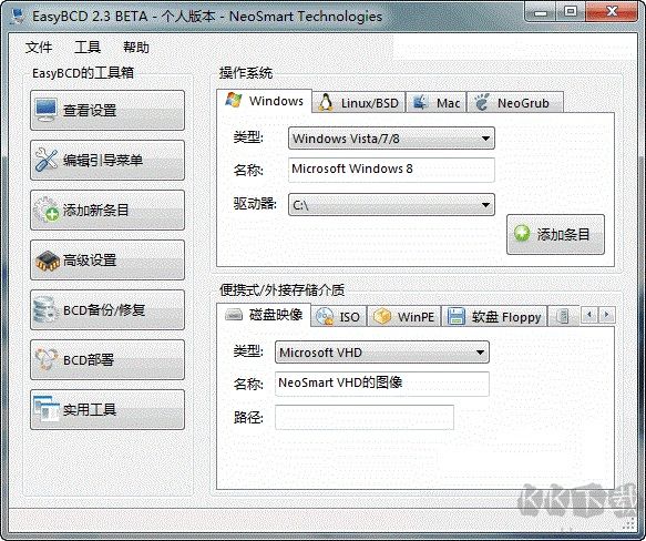 EasyBCD支持安裝到虛擬硬盤(VHD)的Win 7/ 8系統(tǒng)啟動(dòng),不支持微軟官方發(fā)布的Windows VHD虛擬系統(tǒng)鏡像文件正常啟動(dòng)(包括Win XP/Vista/7)。