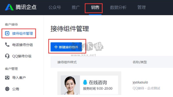 2、在銷售中的“接待組件管理”中,新建接待組件;(如果沒有新建過接待分組,可前往電話/QQ接待分組先新建分組)