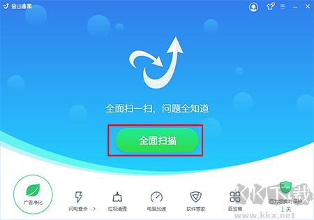 1.打開金山毒霸,點(diǎn)擊“全面掃描”