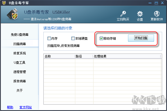 高效查殺:完全查殺文件夾exe、auto.exe、vbs病毒、u盤文件夾被隱藏等千種U盤病毒;