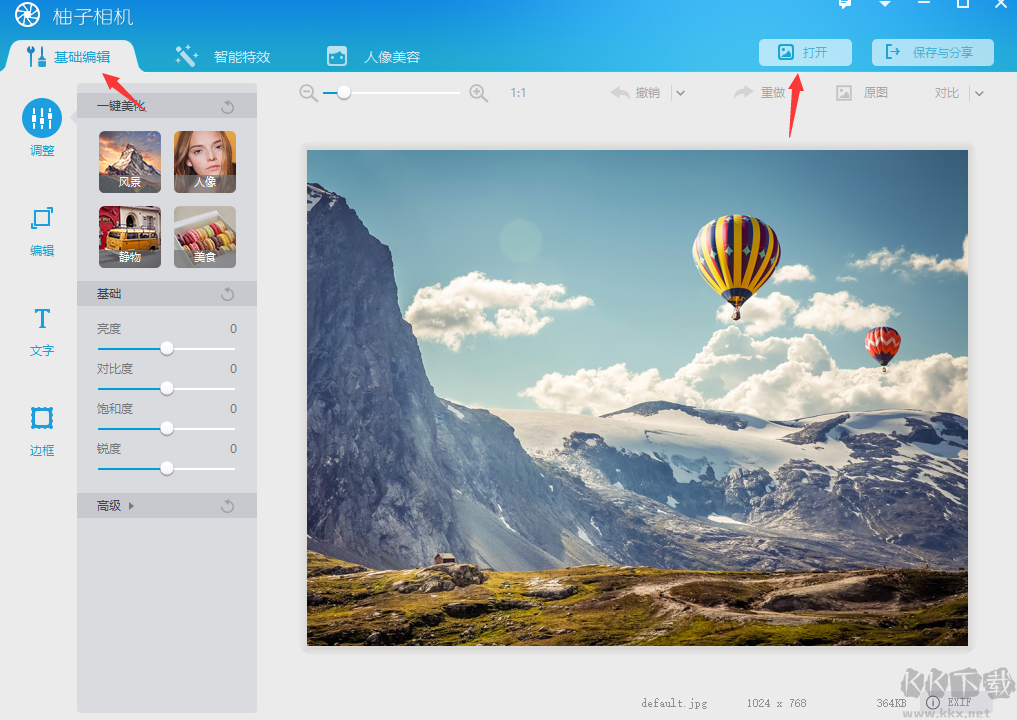 1、打開柚子相機,然后點擊基礎編輯中的“打開”