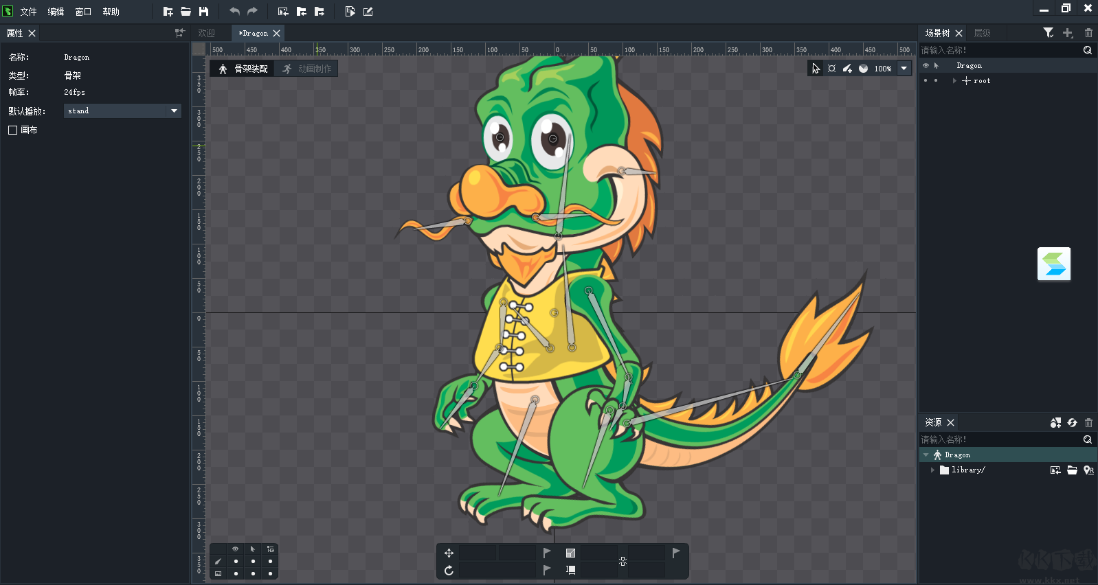 DragonBones Pro電腦版是一款骨骼動畫制作軟件,這款軟件為用戶提供了非常強大的動畫制作功能,用戶能夠利用這款軟件輕松的制作出人物,動物,機械等,有了這款軟件,用戶就能快速的完成游戲動畫制作,感興趣或者有需要的小伙伴就快來kk網(wǎng)站下載體驗一下吧。