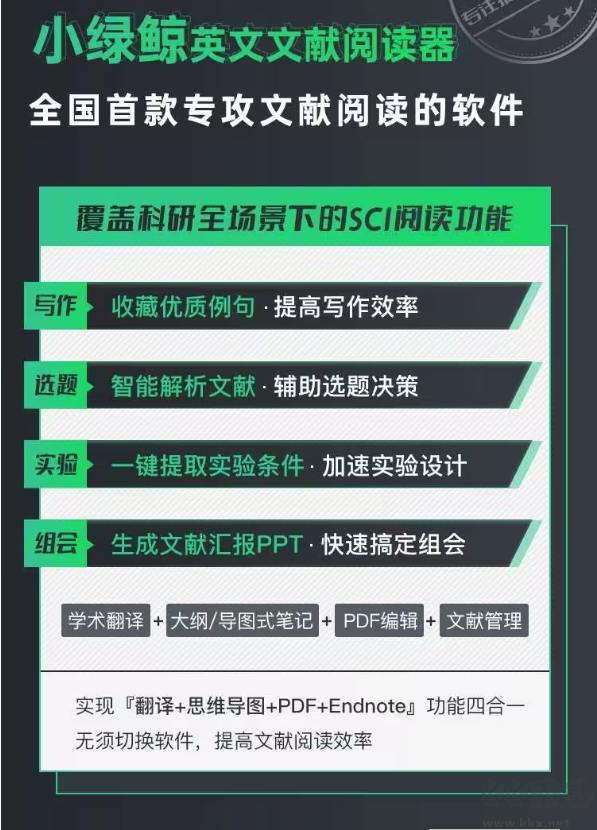 小綠鯨是一款專注提高英文文獻閱讀效率的軟件,集翻譯、文獻管理、筆記、速讀、解析、寫作、云端閱讀功能于一體,針對【選題、做實驗、寫論文、組會匯報】四大文獻閱讀場景設計了專業(yè)的解決方案,從各個環(huán)節(jié)提高科研工作效率。