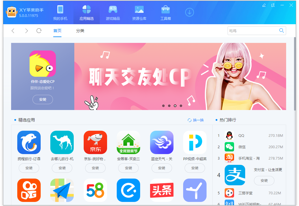 kk下載站分享提供《XY蘋果手機(jī)助手》下載,XY蘋果手機(jī)助手是一款專為蘋果手機(jī)用戶打造設(shè)計(jì)的手機(jī)管理軟件。為廣大果粉們提供專業(yè)的數(shù)據(jù)備份,手機(jī)空間清理,海量應(yīng)有,游戲下載,并且支持蘋果手機(jī)數(shù)據(jù)恢復(fù)??胺Q蘋果用戶們的必備軟件,更有工具箱服務(wù),只需連接手機(jī)即可進(jìn)行手機(jī)全機(jī)體檢,手機(jī)內(nèi)置應(yīng)有資源快速管理等等便捷功能。蘋果用戶們不要錯(cuò)過了,快來下載體驗(yàn)吧!