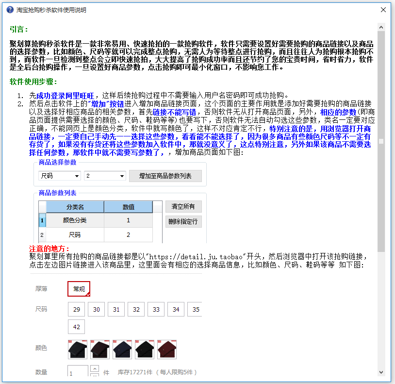 聚劃算搶購秒殺軟件是一款非常易用、 快速搶拍的一款搶購軟件,軟件只需要設(shè)置好需要搶購的商品鏈接以及商品的選擇參數(shù),比如顏色、尺碼等就可以完成整點搶購,無需人為等待整點進行搶購,而且往往人為搶購根本搶購不到,而軟件-旦檢測到整點會立即快速搶拍,大大提高了搶購成功率而且還節(jié)約了您的寶貴時間,省時省力,軟件是全后臺搶購操作,- 旦設(shè)置好商品參數(shù), 點擊搶購即可最小化窗口,不影響您工作。需要在淘寶中搶購秒殺商品的用戶快來獲取這款搶購軟件吧!