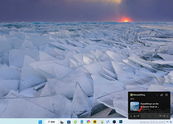 1、在桌面下面的小圖標里點擊必應壁紙,出現彈窗后通過上一個或者下一個;