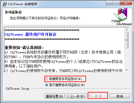 1.將KK下載分享的壓縮包解壓到本地,得到的文件夾打開后雙擊cajviewer,打開安裝程序,可以看到下圖所示的提示: