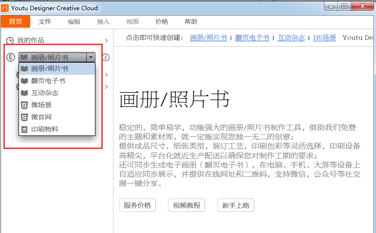 1、打開軟件,選擇要制作的類型,打開下拉菜單,其提供了畫冊(cè)、電子書、互動(dòng)雜志、H5場(chǎng)景等多種類型。
