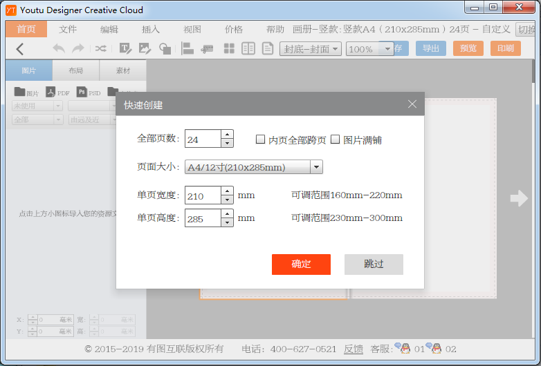 3、進(jìn)入快速創(chuàng)建的窗口,用戶可以設(shè)置頁數(shù)、圖片滿鋪、單頁寬度等參數(shù)。