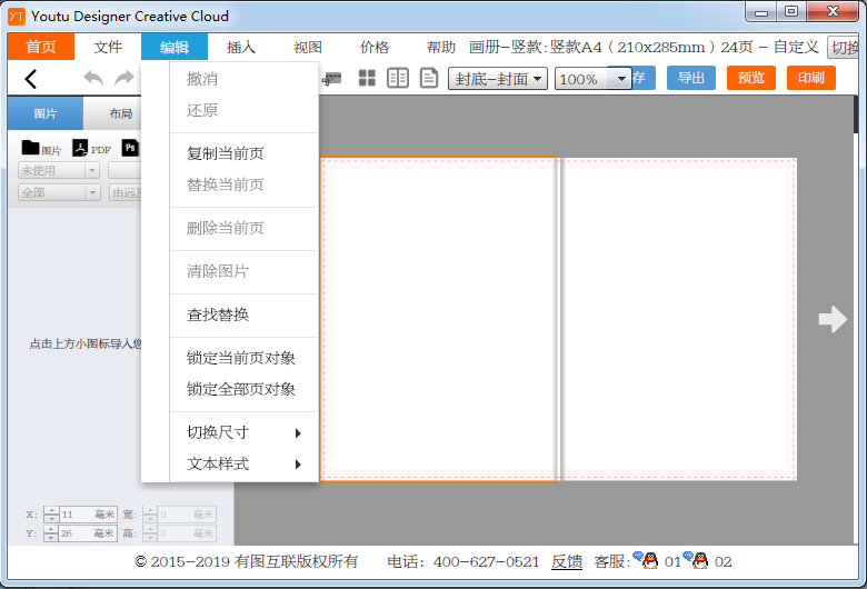 4、在編輯一欄中提供了撤消、還原、復(fù)制當(dāng)前頁、替換當(dāng)前頁、刪除當(dāng)前頁、清除圖片、查找替換、鎖定當(dāng)前頁對(duì)象、鎖定全部頁對(duì)象、切換尺寸、文本樣式等編輯操作。