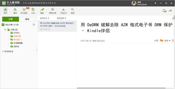 本人知識(shí)門戶網(wǎng),在自身的“個(gè)人圖書館”中編寫并儲(chǔ)存原創(chuàng)文章,對(duì)收藏的大量文章開展樹型文件目錄式分組管理立即在自身的“個(gè)人圖書館”中檢索將累積的好文章隨時(shí)隨地帶在身邊,免遭遺失及病毒感染侵蝕之苦。