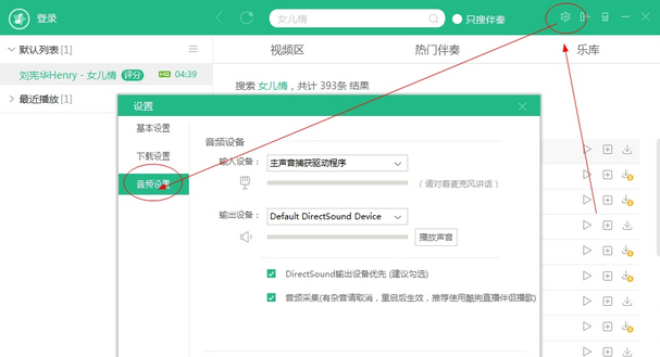 1、打開軟件后,在左側(cè)可以建立列表,右側(cè)音頻區(qū)或者頂部搜索自己喜歡的歌曲,如:女兒情,添加到列表,即可開始播放伴奏,這時(shí)候?qū)χ溈孙L(fēng)演唱即可。