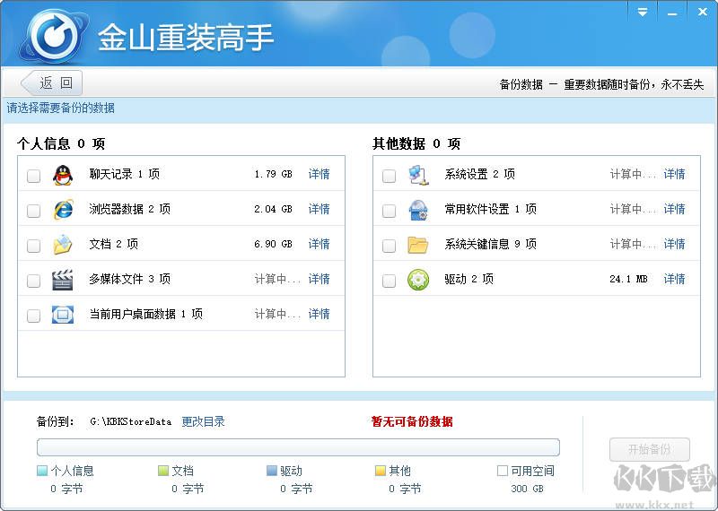 1、首先備份數(shù)據(jù),重裝系統(tǒng)可以快速備份QQ、MSN、旺旺等聊天記錄,我的文檔、桌面、IE收藏夾、郵件等重要個(gè)人數(shù)據(jù),確保永不丟失,重裝完成后可進(jìn)行還原。對(duì)于不支持備份的項(xiàng)目,需要您自己備份數(shù)據(jù)。所涉及的備份內(nèi)容非常的全面,用戶需要做的就只是勾選需要備份的文件,備份就這么簡單