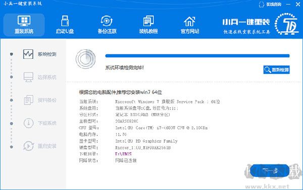 一、下載小兵一鍵重裝系統(tǒng)軟件,然后打開(kāi)軟件小兵一鍵重裝系統(tǒng)會(huì)檢測(cè)您的電腦信息。如下圖: