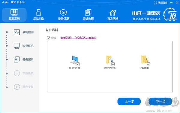 三、點(diǎn)擊“下一步“,進(jìn)入資料備份界面,通過(guò)勾選可以選擇對(duì)“我的文檔”、“收藏夾”、“桌面文件”進(jìn)行備份,備份資料會(huì)保存到自動(dòng)生成的本地最大的分區(qū)“X:\XBOS\BACKUP”目錄內(nèi),此目錄會(huì)根據(jù)電腦磁盤(pán)中最大剩余空間容量作為文件、系統(tǒng)的備份以及下載的系統(tǒng)自動(dòng)產(chǎn)生。如下圖所示: