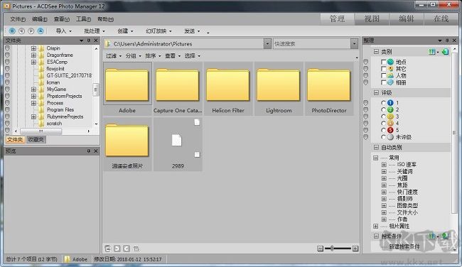 ACDSee 12是ACCESS眾多版本中比較好用的版本,功能齊全而不臃腫,有了它可以幾乎一網(wǎng)打飛所有圖片文件格式,ACDSee擁有最快的看圖速度和強大的圖片管理能力,是設計、攝影人員最佳圖像管理軟件。KK下載站分享是直裝版,直接安裝即可使用!