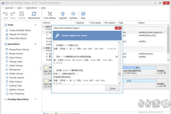 我們可以借助MPE掃描并修復硬盤的邏輯壞道,比如很多邏輯壞道位于硬盤的系統(tǒng)分區(qū)上,它可以直接掃描系統(tǒng)分區(qū)(Windows 10自帶組件則只能在重啟并再次進入系統(tǒng)前掃描)。同上選中需要掃描的硬盤,接著在其分區(qū)列表中選擇需要掃描的分區(qū),點擊左側窗格的“Operations→Check volume”,激活掃描組件后進行掃描和恢復即可(圖5)。