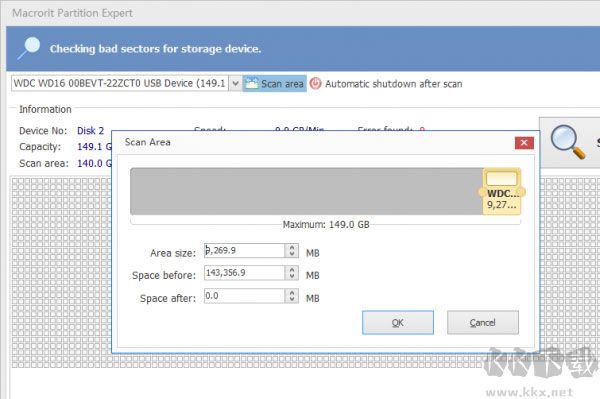 – 分區(qū)表面測試:掃描分區(qū)(選擇掃描區(qū)域)檢查并查找壞扇區(qū)