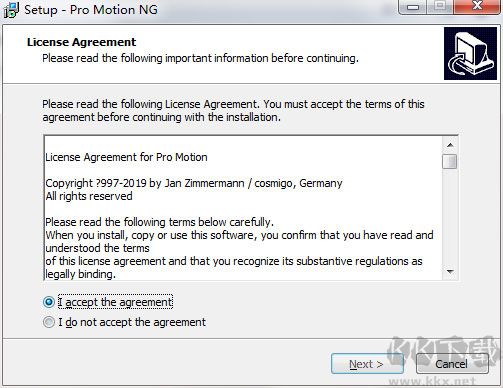 1、在本站下載并解壓,雙擊運(yùn)行“pro-motion-ng.exe”安裝原程序,閱讀安裝許可協(xié)議,點(diǎn)擊我同意,點(diǎn)擊下一步