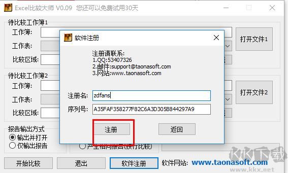 1、雙擊“Excel比較大師.exe”程序打開(kāi)軟件,可以看到剩余30天試用期,點(diǎn)擊軟件注冊(cè)。