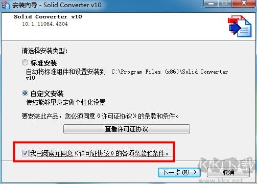 1、在本站下載并解壓,雙擊運行“solidconverterpdf.exe”安裝原程序,如圖所示,選擇自定義安裝,勾選許可協(xié)議選項,點擊下一步