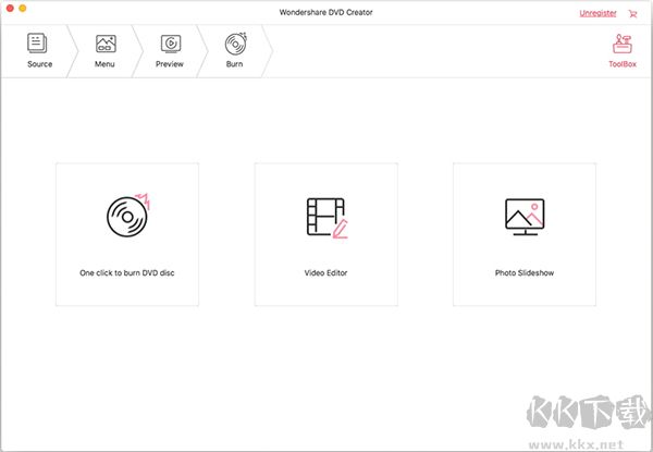 如果你使用的是Wondershare DVD Creator for Mac,你會(huì)注意到工具箱包括一鍵刻錄DVD光盤、視頻編輯器和照片幻燈片3獎(jiǎng)勵(lì)功能。