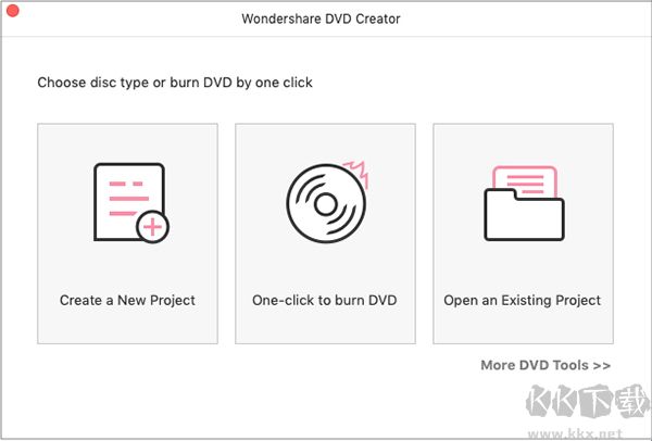 請(qǐng)注意,Wondershare DVD Creator for Mac 的啟動(dòng)頁(yè)面包含創(chuàng)建新項(xiàng)目、一鍵刻錄 DVD、打開(kāi)現(xiàn)有項(xiàng)目和更多 DVD 工具 >> 4 個(gè)部分。