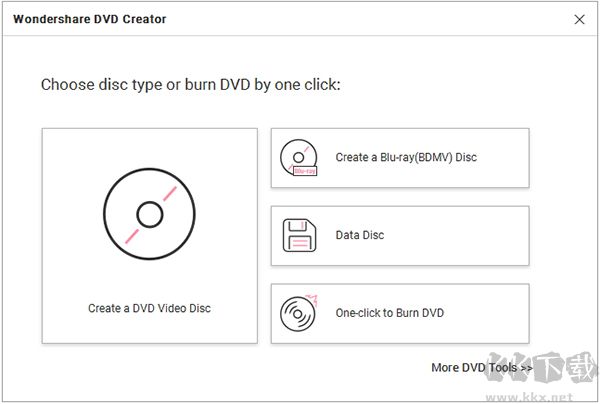 啟動(dòng)Wondershare DVD Creator,您將看到如下啟動(dòng)頁(yè)面,其中包括創(chuàng)建DVD視頻光盤、創(chuàng)建藍(lán)光(BDMV)光盤、數(shù)據(jù)光盤、一鍵刻錄DVD和更多DVD工具>> 5部分。