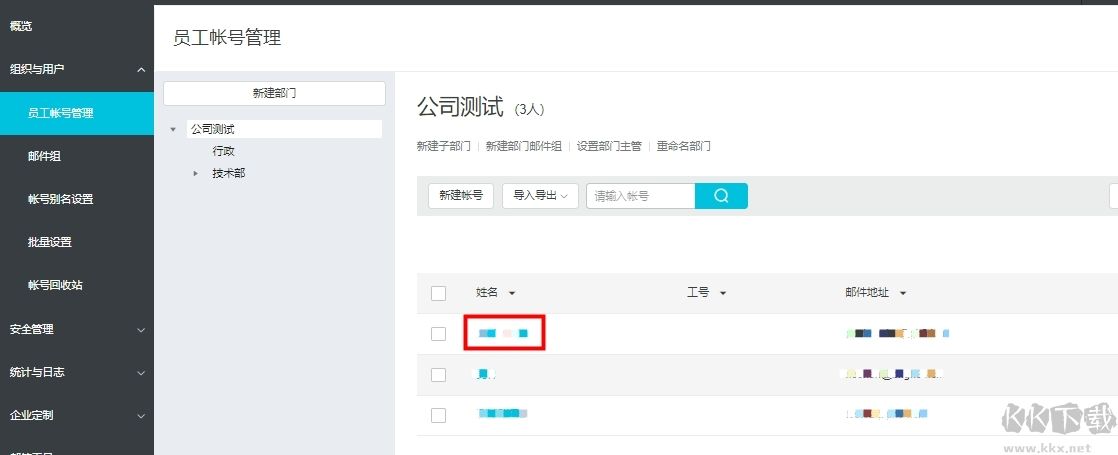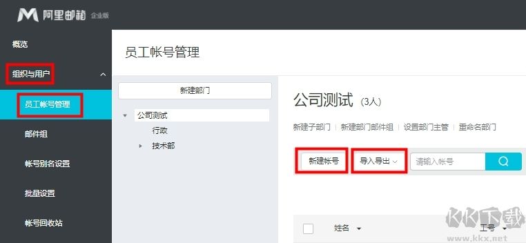 點(diǎn)擊域管理頁(yè)面左側(cè)的員工賬號(hào)管理,通過(guò)新建賬號(hào)可創(chuàng)建單個(gè)賬號(hào),通過(guò)導(dǎo)入可批量創(chuàng)建賬號(hào)。