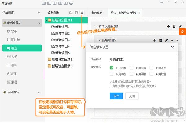 設(shè)定文檔提供關(guān)于作品的相關(guān)設(shè)定的管理。設(shè)定最多提供三級設(shè)定,系統(tǒng)還提供了系統(tǒng)默認模板。