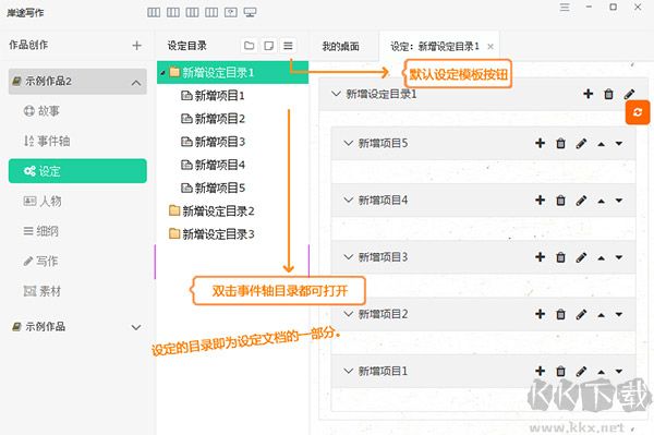 提供故事、事件軸、設(shè)定、人物、細綱、寫作、素材等諸多文檔的多選項卡窗口形式,方便即時切換必要的窗口。