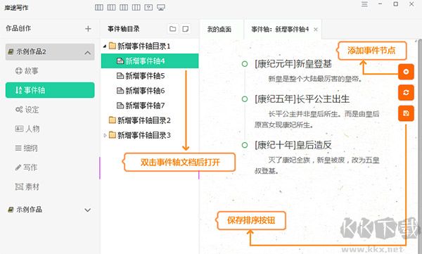 軟件提供了故事、事件軸、設(shè)定、人物、細綱、寫作窗口以及素材等面向長篇小說構(gòu)思、創(chuàng)作以及寫作的諸多文檔能力。