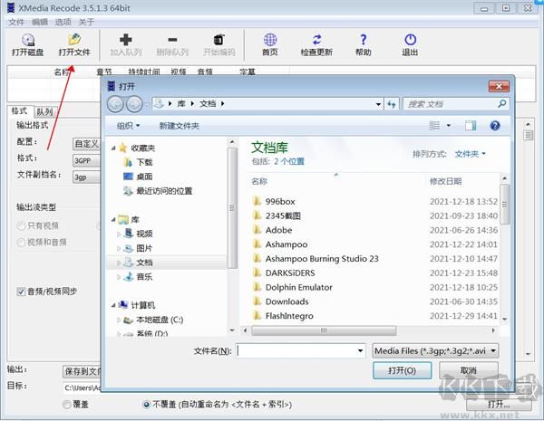 2、我們點(diǎn)擊“打開(kāi)文件”按鈕,然后打開(kāi)要轉(zhuǎn)換的音/視頻文件(若需要轉(zhuǎn)換DVD/藍(lán)光光盤(pán)等,可以點(diǎn)擊“open disk”按鈕)。