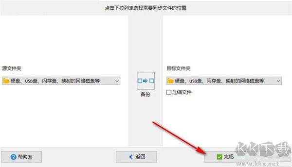 4、之后是設(shè)置備份同步的位置,我們點(diǎn)擊完成按鈕進(jìn)入到設(shè)置備份源文件夾和目標(biāo)文件夾的界面。