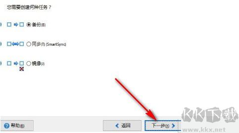 3、點(diǎn)擊下一步是選擇創(chuàng)建任務(wù)的類(lèi)型,有備份、同步和鏡像,選擇備份之后點(diǎn)擊下一步。