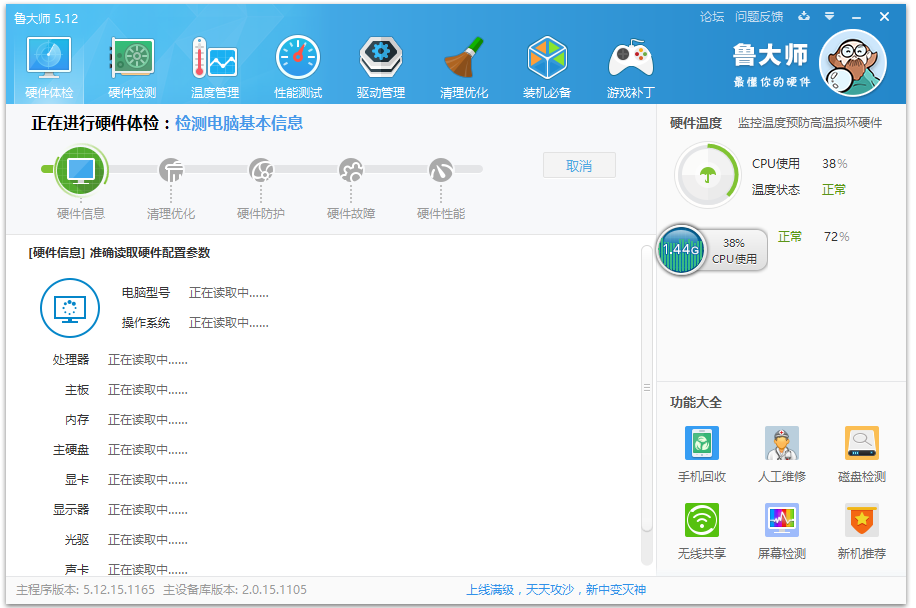 打開魯大師,進入主界面,點擊【硬件體檢】即可檢測電腦硬件;