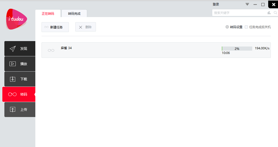 打開(kāi)itudou播放器,選擇一個(gè)已經(jīng)下載好的視頻,點(diǎn)擊【轉(zhuǎn)碼】,如下圖,