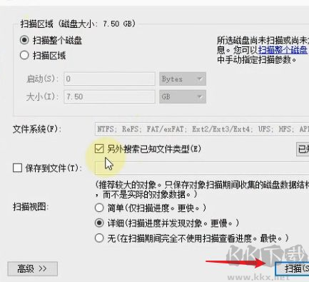 4、接著會彈出掃描的設(shè)置界面,這里會顯示磁盤的大小,在設(shè)置界面的下方會有個掃描視圖,分為三種情況,一種是簡單,只是掃描進(jìn)度,一種是詳細(xì),這個掃描起來比較慢,因?yàn)閽呙枭抖硷@示,肯定慢,最后一種就是無,也就是啥也不顯示,直接后臺運(yùn)行,這個當(dāng)然是最快的了,根據(jù)自己的情況選擇,選擇好后點(diǎn)擊掃描選項。