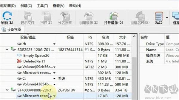 2、在設(shè)備視圖中顯示出系統(tǒng)中的所有磁盤信息,找到并選中要恢復(fù)的盤符,同時在右窗口會顯示當(dāng)前磁盤的相關(guān)信息。