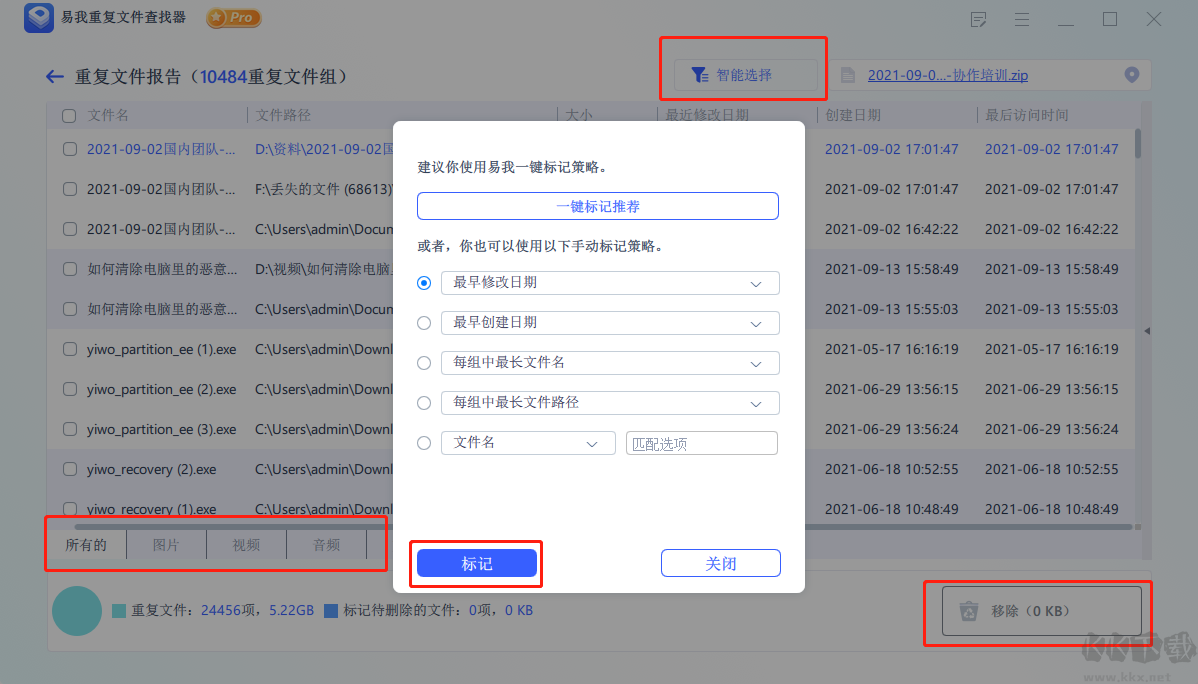 在「重復(fù)文件報(bào)告」頁(yè)面中,會(huì)顯示出所有重復(fù)文件,可根據(jù)文件類型更準(zhǔn)確選擇自己要?jiǎng)h除的文件,同時(shí)也能在「智能選擇」中使用「一鍵標(biāo)記策略」和「手動(dòng)標(biāo)記策略」來(lái)確定刪除的文件,標(biāo)記后點(diǎn)擊右下角「移除」并選擇對(duì)應(yīng)選項(xiàng)。