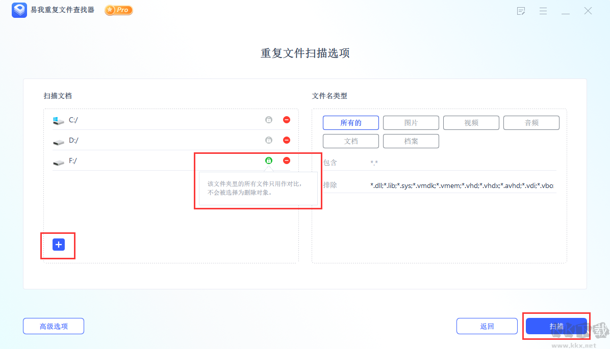 2)在重復(fù)文件掃描選項(xiàng)頁(yè)面中,點(diǎn)擊「+」按鈕可以選擇要掃描的文件夾或磁盤,點(diǎn)擊掃描文檔列表中右側(cè)「“鎖”」圖標(biāo),則表示該磁盤文件只做對(duì)比而不會(huì)被選作刪除對(duì)象,如果不想對(duì)掃描列表中某個(gè)磁盤或文件夾進(jìn)行掃描,點(diǎn)擊「Θ」按鈕去掉即可,在「文件名類型」中也可以根據(jù)自己的需求進(jìn)行選擇,完成后點(diǎn)擊「掃描」。